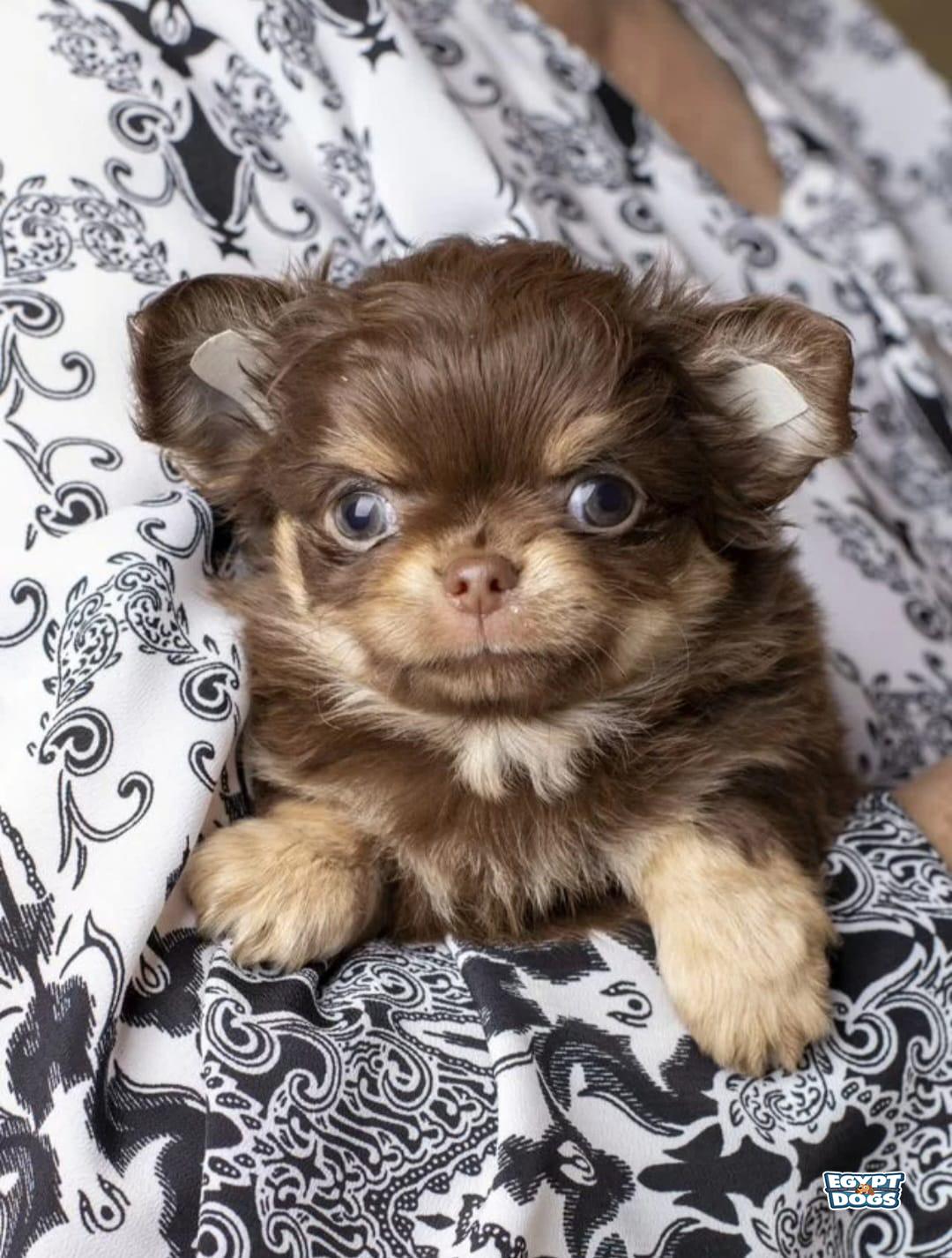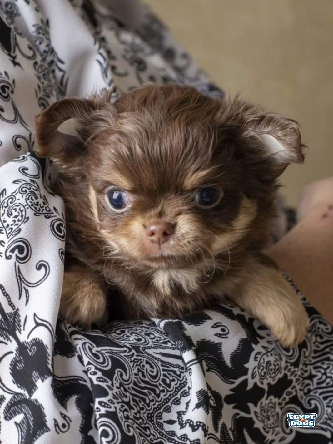 Long-haired Chihuahua puppies, chocolate and tan. Affectionate, gentle creatures who love to play with people. They have full documentation and age-appropriate vaccinations. They are potty trained and eat premium food.