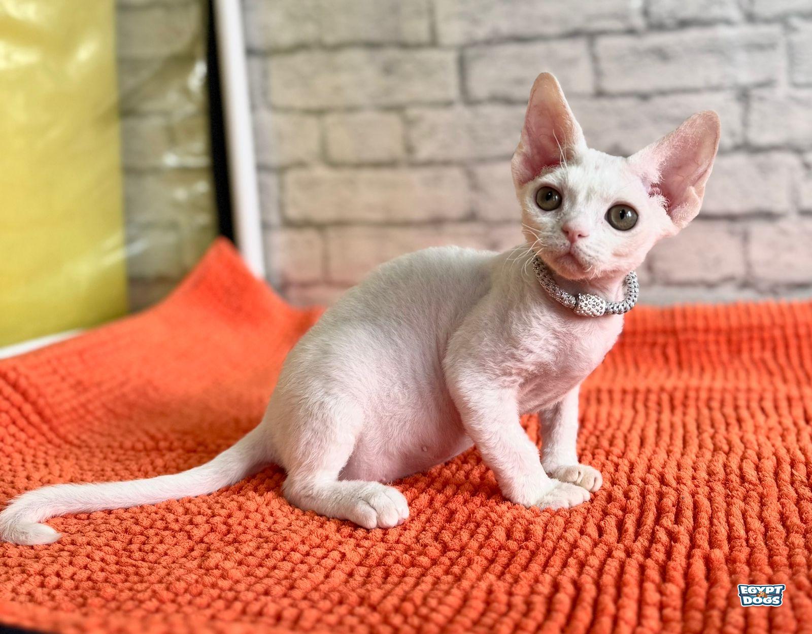 Beautiful and charming Devon Rex male kitten with an elegant white coat. Gandalf has a playful personality, affectionate temperament, and the unique curly features that make this breed so special.