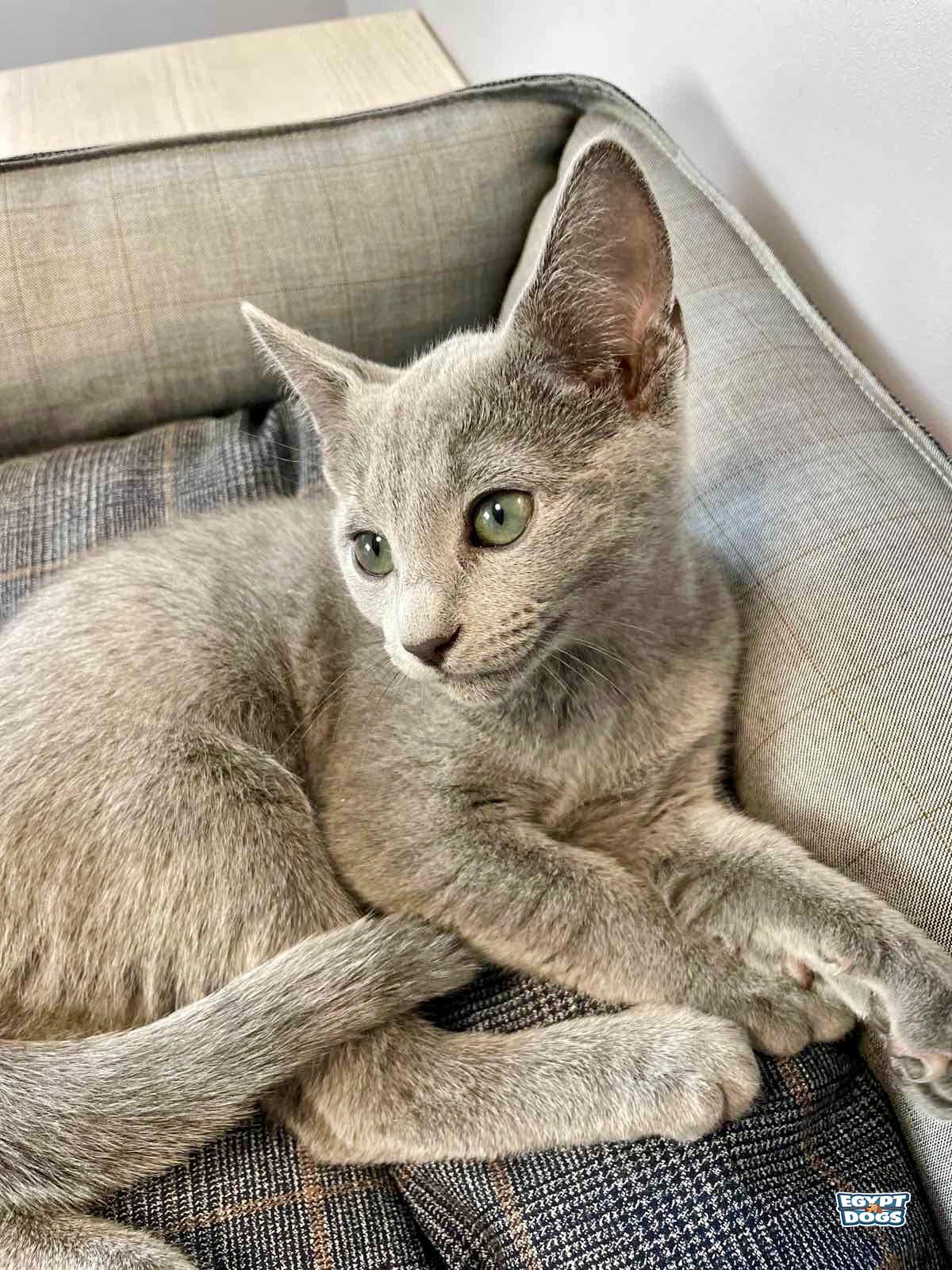 Elegant Russian Blue male kitten with a stunning blue coat and expressive eyes. Jean has a gentle, calm, and affectionate personality, making him a perfect companion.