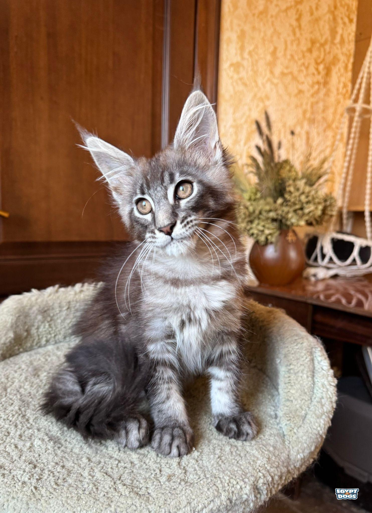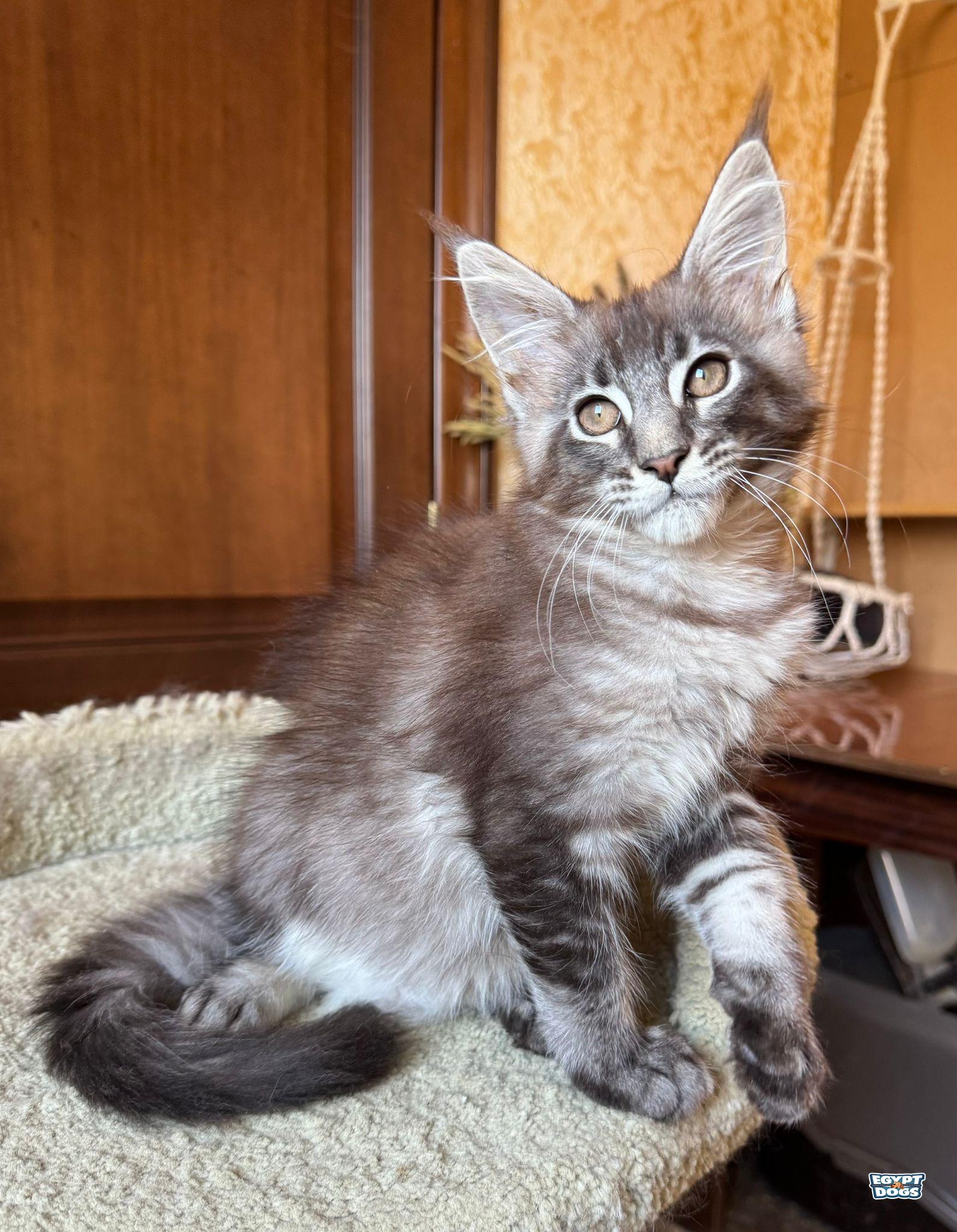 Beautiful Maine Coon male kitten with a striking coat and strong, majestic appearance. Umka has a friendly, playful, and affectionate personality, typical of this wonderful breed.