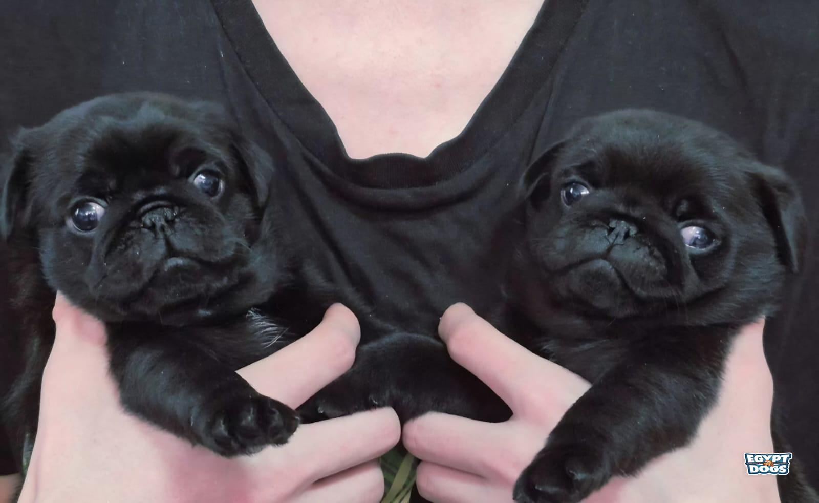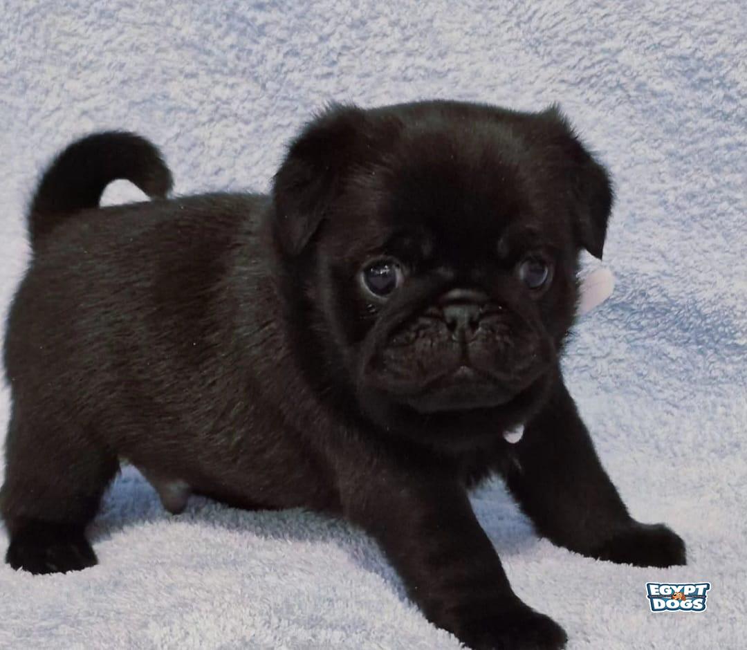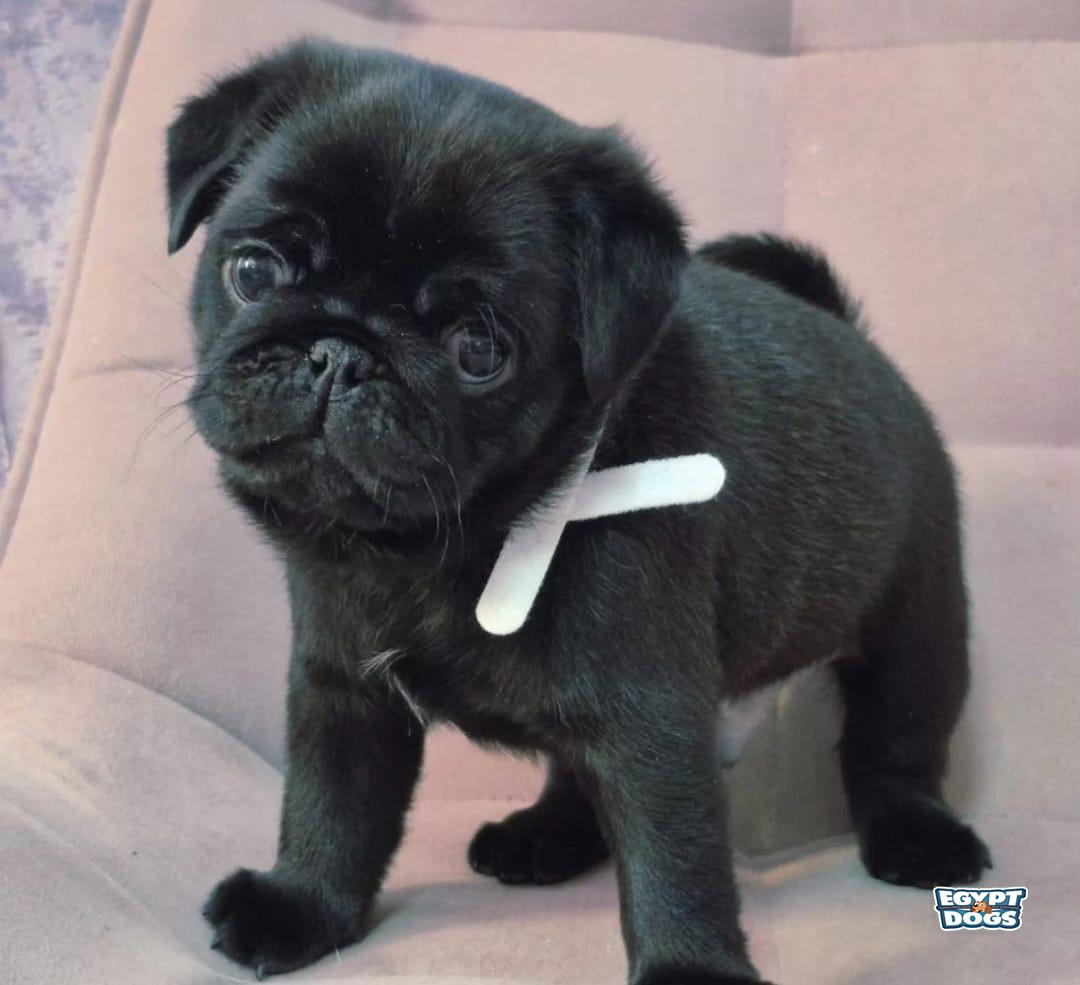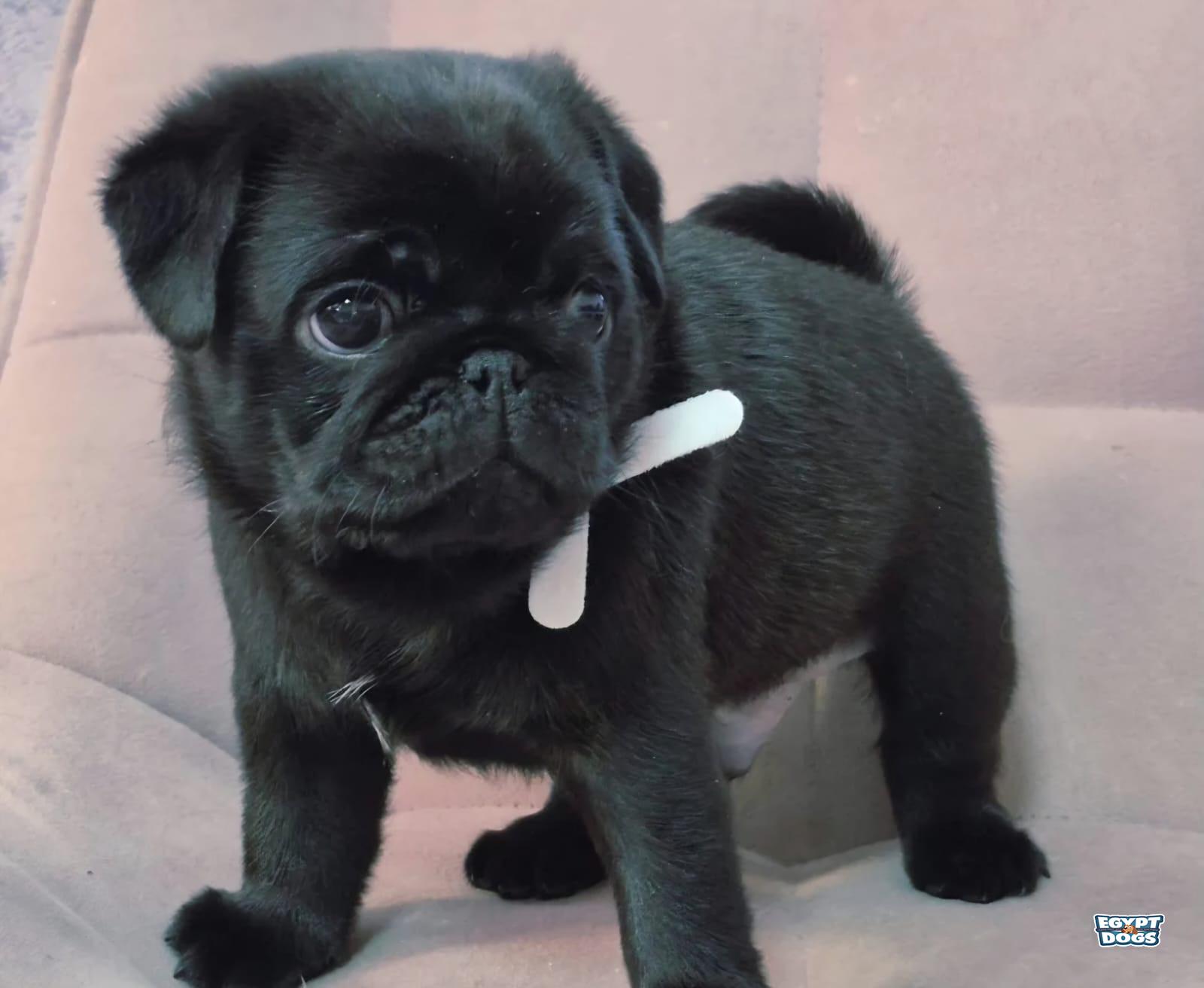 purebred black pug puppy from show-qualified parents. He will be ready for adoption after being vetted and receiving two vaccinations. He has an FCI certificate, a tattoo, and a veterinary passport.